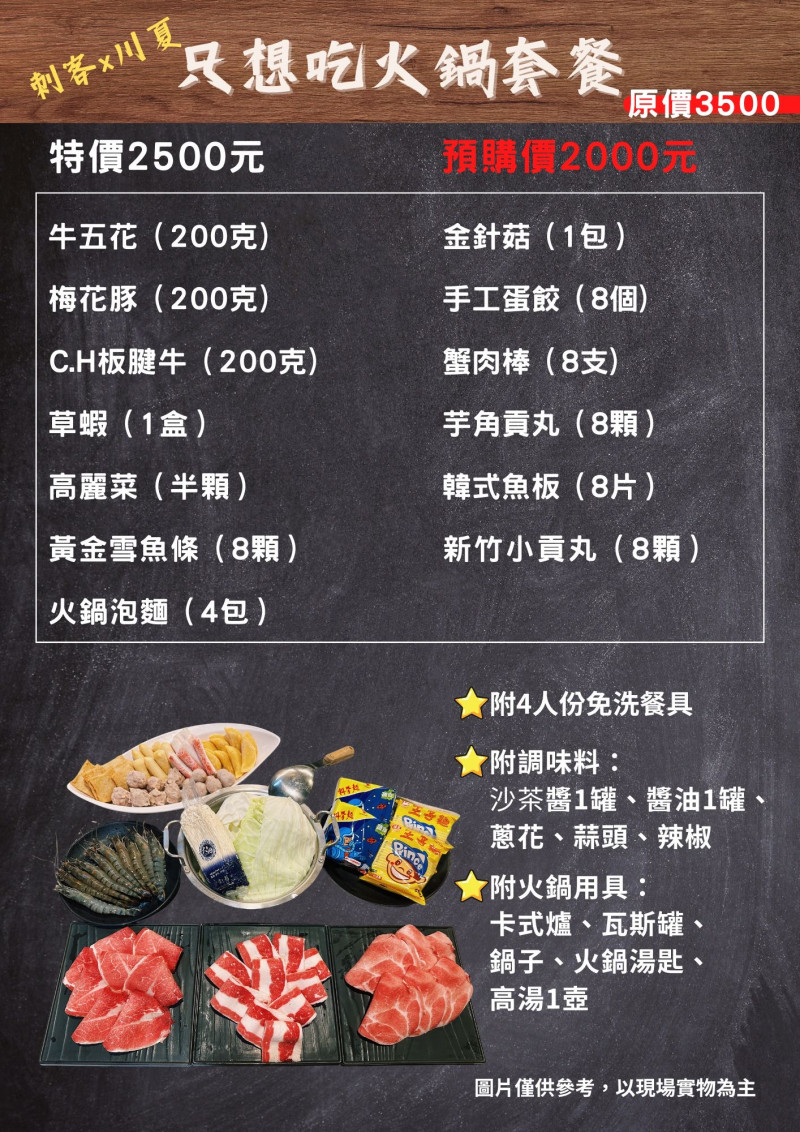 🌟附屬設備:卡式爐、2人份火鍋鍋子、火鍋湯匙、餐桌椅、刀子、削皮刀、砧板、剪刀、洗菜籃、冷藏冰箱、冷凍庫、飲水機、流理台、洗碗精、菜瓜布等